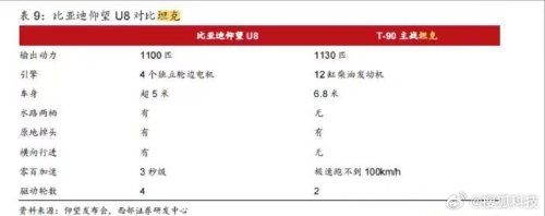 报告第26页中对“易四方四轮边电机输出强大动力”进行解读,表9中将比亚迪仰望U8对比T-90主战坦克,比亚迪仰望U8具有的“水陆两栖”、“原地掉头”、“横向行进”等功能,坦克均“无”。