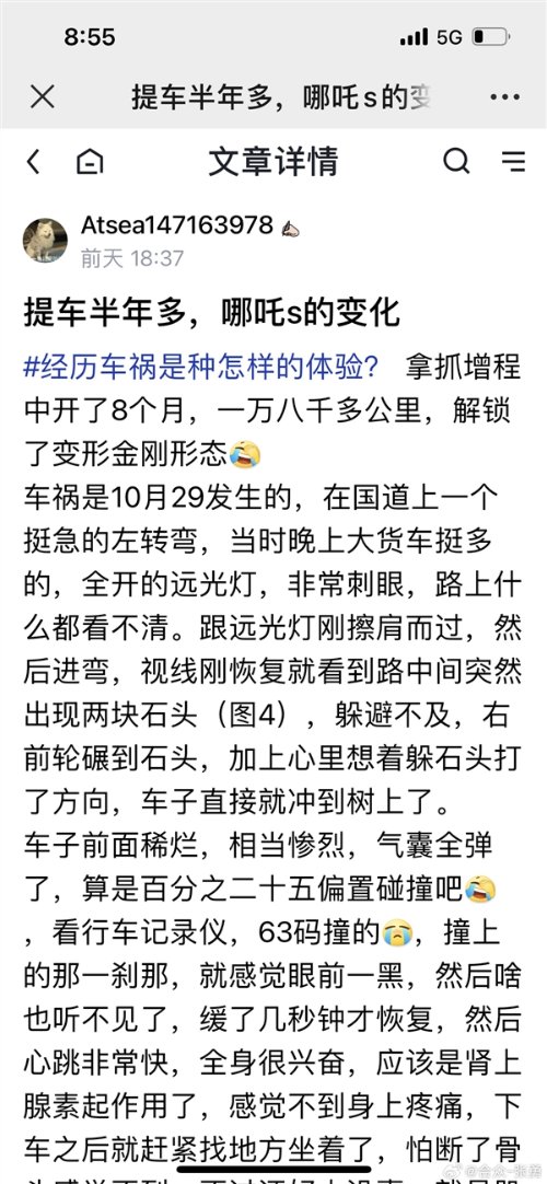 据车主表述,自己的车是哪吒S增程版后驱中版,开了8个月,已经行驶了一万八前多公里,然而上个月底,他遭遇了一起严重事故,车主倒是非常乐观,戏称车子“解锁了变形金刚形态”。事故发生在10月19日晚,由于夜晚国道行车时,被对向行驶的大货车远光灯晃眼,导致在左转弯时没能及时避开路中的石头,导致右前轮碾压上去,车子失控随后撞树。