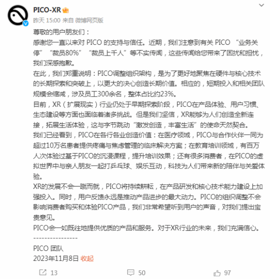 PICO也坦然表示目前XR行业仍处于早期探索阶段,发展不会一蹴而就,PICO在诸多方面也面临着挑战,但未来仍将在产品研发和核心技术能力建设上加强投入。同时PICO还强调,此次裁员不会对消费者购买体验产生影响,并表示用户反馈永远是推动产品进步的最大动力。