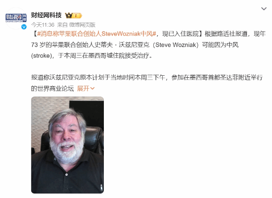 财经网科技消息,根据路透社报道,现年 73 岁的苹果联合创始人史蒂夫?沃兹尼亚克(Steve Wozniak)可能因为中风 (stroke),于本周三在墨西哥城住院接受治疗。