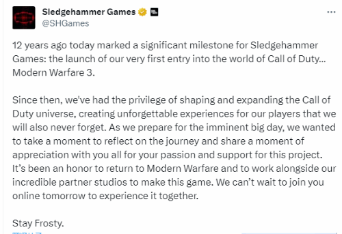 明天(11月10日),《使命召唤20:现代战争3》即将正式发售,主导本作开发的Sledgehammer Games特别发文向玩家表示感谢,同时庆祝原版《现代战争3》发售12周年。