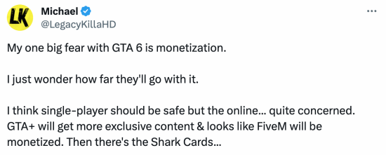 “我认为单人游戏是安全的,但在线模式相当令人担忧。GTA 服务有更多独家内容,并且看起来FiveM会被货币化,然后还有鲨鱼卡....”