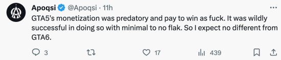 玩家也在评论区表示:“《三男一狗》的货币化是掠夺性的,氪金才能获胜。它在这方面取得了巨大成功,遭到的批评也不多。所以我预计《GTA6》也有类似的情况。”