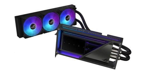 华硕在GeForce RTX 4090 ROG Matrix骇客显卡上使用了一个无缝的金属框架,厚度为2.5槽,有着漂亮的外罩,带有RGB灯效,板卡部分没有配备任何风扇,尾部有金属支架为导液管连接处提供支撑,整合了液态金属导热组件,所有散热均由一体式水冷解决方案提供。与之搭配的是ROG MF-12 ARGB系列风扇,也就是近期新款ROG Ryujin龙神 III 系列一体式水冷散热器使用的款式,采用了磁吸式链接的方式,便于玩家操作。