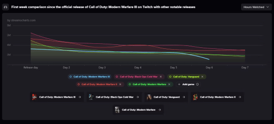 与近年的几部《使命召唤》相比,《现代战争3》的反响平平,尽管收视率稳定,但未能创下新纪录。据了解,2020年《冷战》的首播观看时长达650万小时,几乎是《现代战争3》的一倍。即使是前作《现代战争2》,首播日也获得了530万小时的观看时长,这足以看出玩家的越来越缺乏兴趣。