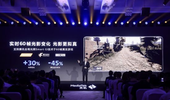 不仅如此,联发科与腾讯游戏研发效能部共同开发了SmartGI–适应性全局光照算法。通过全局光照技术,可以让渲染场景中的细节拥有更真实的光影,阴影的变化就像画面上的树叶一样,通过树枝与树叶的明暗交替,呈现实时的自然光影变化,让游戏画面更加栩栩如生。