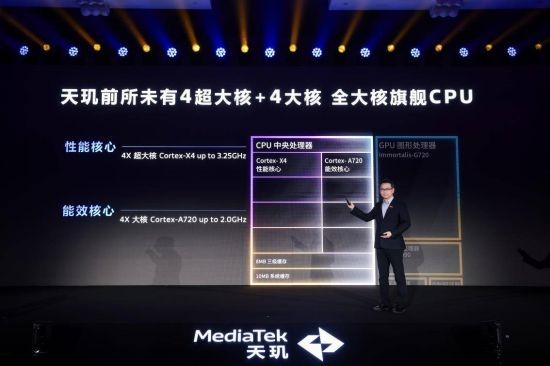 天玑9300的全大核CPU架构包括4个Cortex-X4超大核和4个Cortex-A720大核,超大核最高主频达3.25GHz,CPU峰值性能提升达40%,功耗降低33%。强大的CPU性能和能效为天玑9300的游戏表现提供了极为强劲的动力基础,经实测全大核CPU在GeekBench中多核性能第一。同时,天玑9300采用了Arm最新的Immortalis–G720旗舰12核GPU,峰值性能提升46%,在相同性能下功耗可降低40%,图形处理同样的性能、能效双优。由此可见,天玑9300强大的CPU和GPU有充分的实力显著提升游戏体验,成为手游玩家们的“心头好”。