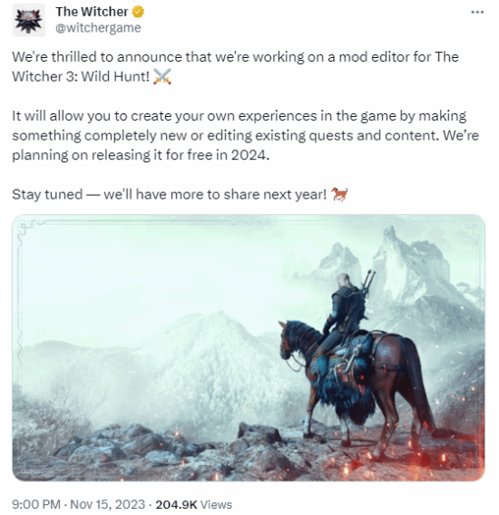 “我们很高兴地宣布,我们正在为《巫师3:狂猎》开发一个mod编辑器!它将允许你通过创造全新内容或编辑现有任务和内容来创造自己的游戏体验。我们计划在2024年免费发布。敬请期待——明年我们会有更多分享!”