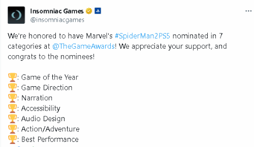 今日(11月16日),失眠组insomniac games发文表示很荣幸《漫威蜘蛛侠2》获得了2023 TGA中七个奖项类别的提名,并向广大玩家的支持表示感谢。