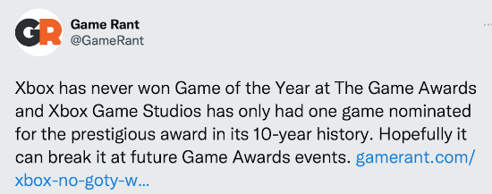 日前,外媒GameRant发文表示,Xbox从未在TGA中获得过年度奖项,而且Xbox工作室在10年中也只有《脑航员2》一款获得过提名,希望他们能在未来打破这种局面。