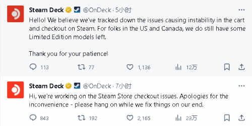 据Steam Deck官推消息,Steam Deck OLED在美国、加拿大地区开卖后,商店平台被大量用户涌入,导致Steam出现购物车结账不稳定的问题,官方正在着手解决相关问题。