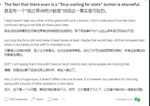 玩家们抱怨,客户端如果没有这个功能会更好,“我觉得这个按钮毫无意义——如果你本来就打算玩下一把游戏的话。而且,当你点击跳过等待统计数据,那么在这些统计数据加载完之前你也无法进入匹配队列。这让人很恼火,何况我也已经习惯了在游戏结束后等待10~20秒来获取统计数据了。”
