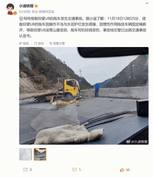 事故认定书载明,11月18日12时25分,搭载仰望U8的拖车因操作不当与水泥护栏发生碰撞,因惯性作用拖挂车辆固定绳断开,导致仰望U8滚落山崖受损,拖车司机轻微受伤。