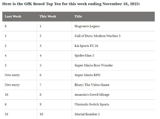 此外,连锁效应使得《EA Sports FC 24》从第二名跌至第三名,而《漫威蜘蛛侠2》仍保持在第四名,《超级马里奥兄弟:惊奇》跌至第五名。