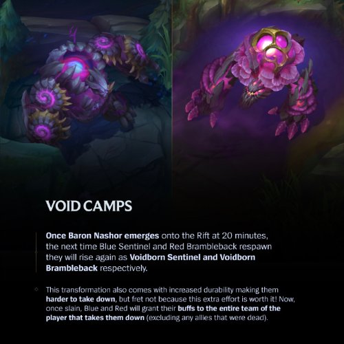 新赛季改动蓝buff以及红buff和峡谷迅捷蟹都被虚空影响。当纳什男爵刷新时,红/蓝buff 下一次刷新时将化为虚空生物。