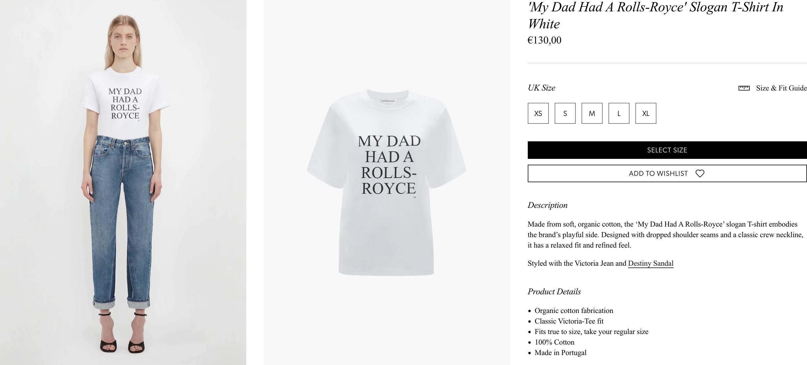 然后今天网友发现,这当时让他她一脸尴尬的对话,现在成为她个人时装品牌的新灵感,维多利亚真的出了这件衣服……卖150美金。
