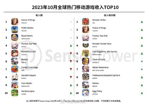 Sensor Tower商店公布情报数据,显示2023年10月腾讯《王者荣耀在全球App Store和Google Play吸金2.22亿美元,蝉联全球手游畅销榜冠军,同时也是收入增长榜第2名。腾讯《PUBG Mobile》(合并《和平精英》收入)以1.37亿美元的收入位列榜单第2名,其中,57.7%的收入来自中国iOS市场。