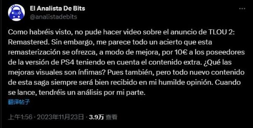 知名视频博主El Analista De Bits今天袒露了自己对于PS5版《最后生还者2》的看法,认为虽然视觉提升很小,但是任何改进都是好事。