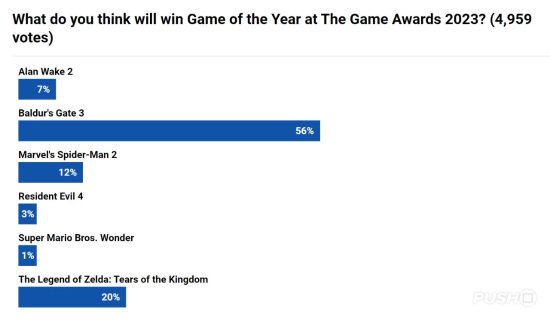 在大约5000名用户参与的投票调查中,有56%的用户为认为《博德之门3》会获奖,考虑到其他作品的整体质量,这个数字令人印象深刻。另外,排名第二的则是《塞尔达传说:王国之泪》,得票率为20%。