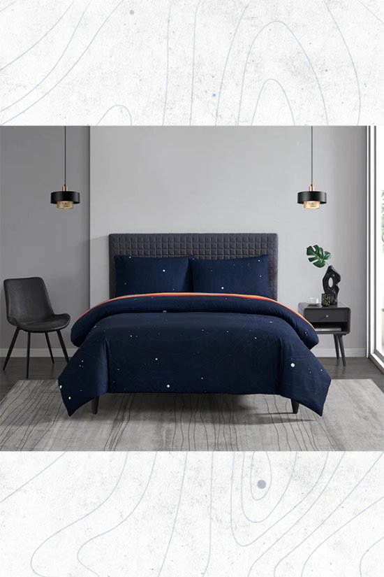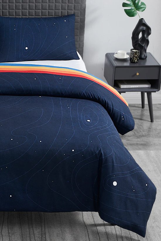产品包括印有星座图案和条纹的羽绒被套和枕套。被套正反面数字印刷,底部留有纽扣,内部有固定系带。并不包括被子和枕头的内部填充。