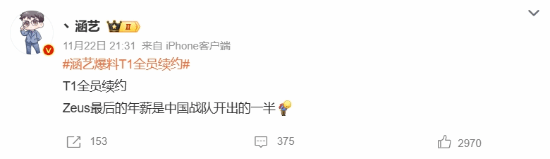 LPL经理人涵艺爆料称,《英雄联盟》T1战队全员续约,Zeus选手的年薪是中国战队开出的一半。