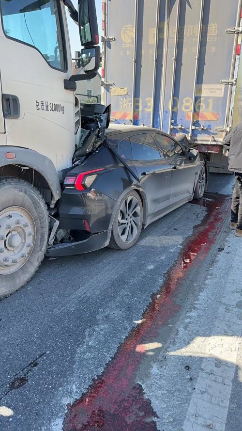 从网上曝光的现场照片和聊天记录看,这台黑色的极氪001应该是被后方大货车追尾后,又推着向前撞上了前方的另外一台厢货车。