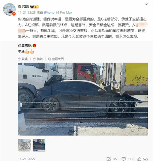 这些照片在网络上传播之后,吸引了很多人的关注,汽车博主袁启聪更是直接盛赞其“牛”。当然也有网友认为,这种交通事故必须看后面的车过来时速度,不能光凭几张图就断定其安全性。