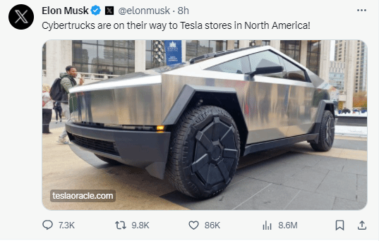 特斯拉CEO埃隆·马斯克在社交平台X透露,Cybertruck电动皮卡正在运往北美特斯拉门店的途中。此前马斯克表示,将于11月30日在得州超级工厂举行Cybertruck交付活动。 ?