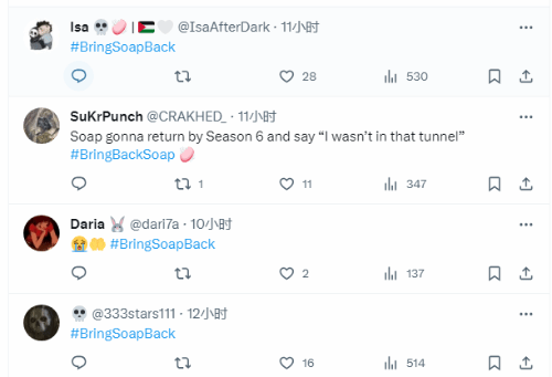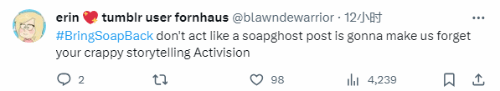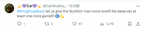 在《使命召唤20:现代战争3》战役尾声,肥皂死在了马卡洛夫的枪下,普莱斯为了纪念他将其骨灰撒在苏格兰的悬崖之上。这样的剧情安排遭到了不少网友的吐槽,还有人发起了“#BringBackSoap”(还我肥皂)的请愿,希望动视能够推出一部独立作品。