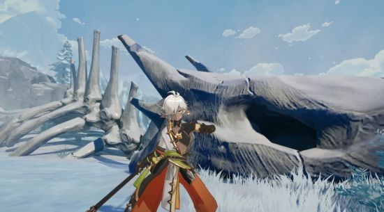 视角流转间,片片雪花翩然而下,落在嶙峋的岩石上、庞然的兽骨旁,野蛮生长的极昼北地浮现在眼前。