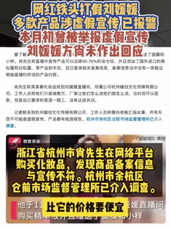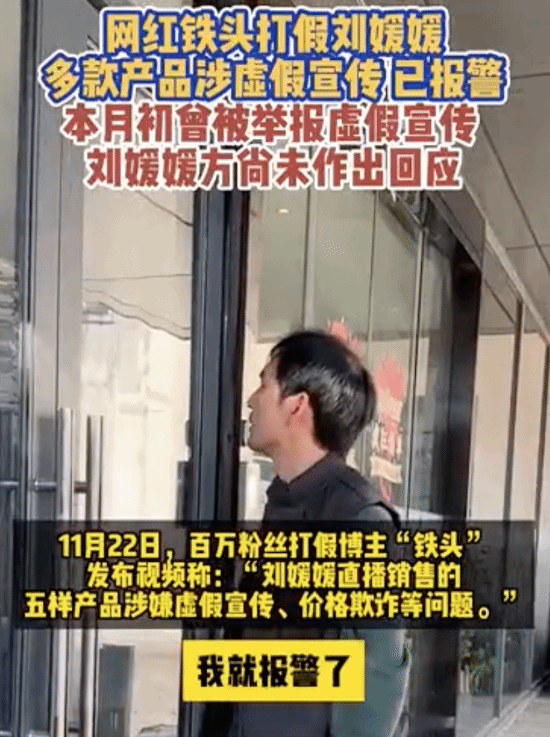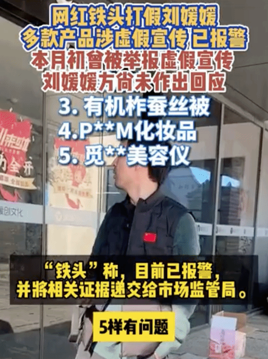 日前,百万粉丝打假博主“铁头”发布视频称:“刘媛媛直播销售的五样产品涉嫌虚假宣传、价格欺诈等问题。”“铁头”称,目前已报警,并将相关证据递交给市场监管局。