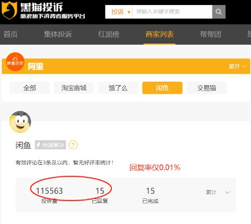 在黑猫投诉平台,闲鱼收到投诉超11万,回复率仅0.01%,相关投诉内容涉及买到假货,无法收退款等。