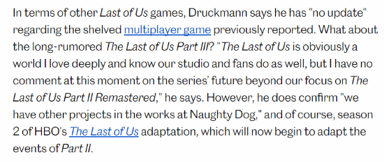 顽皮狗总裁尼尔·德鲁克曼接受《娱乐周刊》采访确认,《最后生还者》多人游戏“没有进展”。至于传闻中的《最后生还者3》,他也不予置评。
