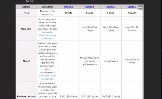 可以看到,暴雪将售价分为了的四个档,从69.99美元到99.99美元不等,分别对应不同级别的奖励。其中99.99美元的选项包含了所有职业的英雄皮肤、独特的坐骑以及每赛季2000白金币等奖励。根据调查,扩展包将包含《暗黑4》游戏本体。