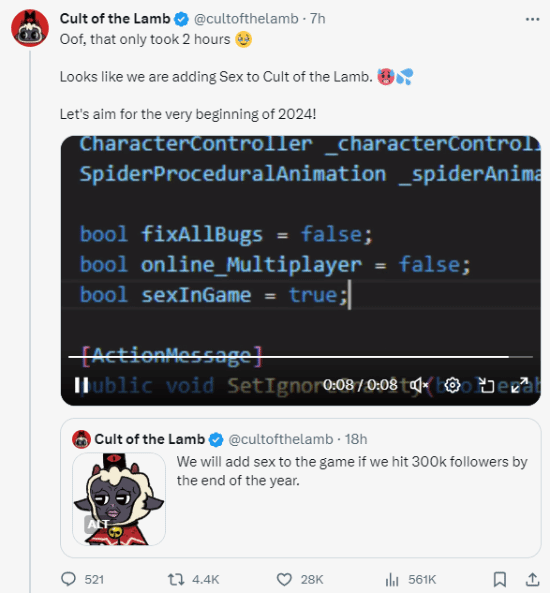 官方在今日表示,2个小时就到30万粉了,他们也将兑现诺言,预计2024年初将“成人”元素添加到游戏中。