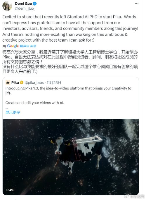 AI文生视频创业领域,迎来了一个令人惊艳的玩家。近日,一家仅四人的初创公司发布全新的AI视频生成工具。29日一整天,国内外社交平台、科技界都被它暴力刷屏。这家名叫Pika的初创公司,也一跃成为全球最炙手可热的AI视频生成公司。而它的创始人郭文景(DemiGuo)曾就读于杭二中,是浙江第一个被哈佛本科提前录取的学生。