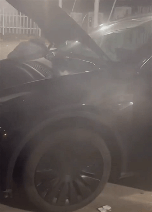 从画面看,这台正在充电中的黑色特斯拉周身确实烟雾弥漫,前舱盖和前排左右车门均被打开,烟雾从车头下方冒出,所幸未见明火,可能并不是燃烧所致。