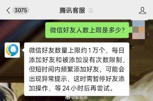 对此,腾讯客服回应称:微信好友数量上限约1万个,每日添加好友和被添加没有次数限制,但短时间内频繁添加好友,可能会出现异常提示,这时需暂停好友添加操作,等24小时后再尝试。