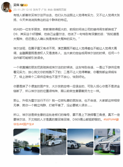 “你要是换了个便宜的国产车,大沙发航空椅一应俱全的,可别人担心你是不是资金链断了,所以埃尔法的位置很特殊,跟以前做生意要戴劳力士一样。”