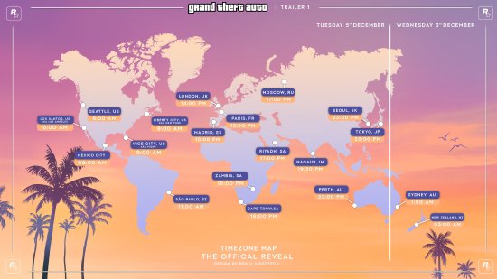即将公布的《GTA6》预告无疑对全世界所有玩家都是一场盛会,为了让时间诶各地的玩家都知道应该在何时及时观看预告,外网的热心粉丝制作了一张《GTA6预告》全球解禁时间图,囊括了全世界19个国家与地区,背景则是采用了同《GTA6》相同的迈阿密风。一起来看一下吧。