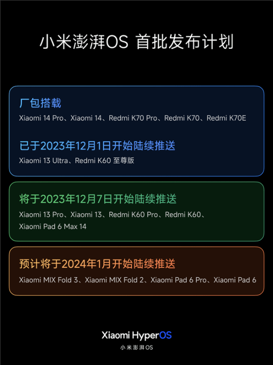 2023年12月7日开始陆续推送:小米13 Pro、小米13、Redmi K60 Pro、Redmi K60、小米Pad 6 Max 14。