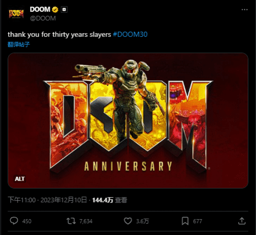 今日(12月11日),《毁灭战士》(DOOM)系列迎来了自己的30周年纪念,官推发布了一张贺图表示庆祝。
