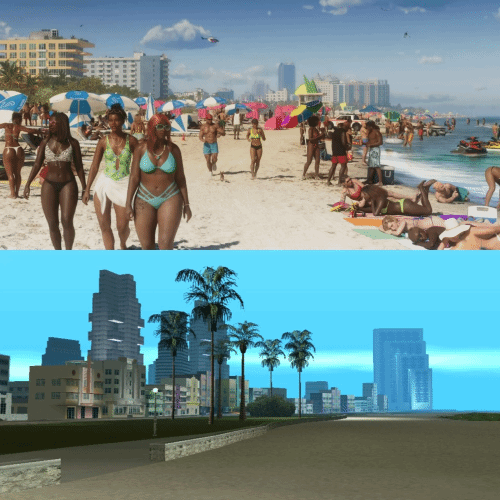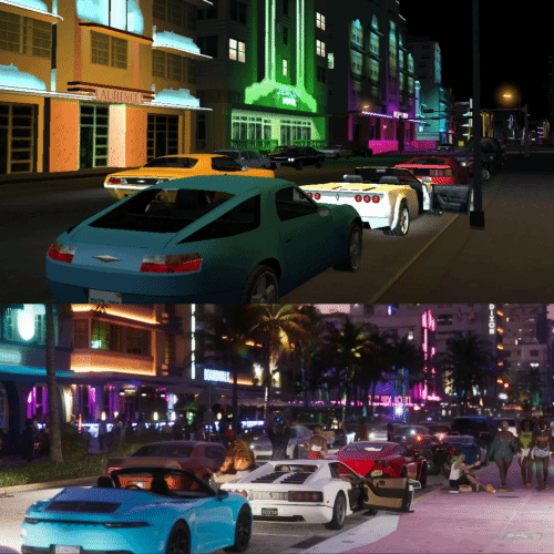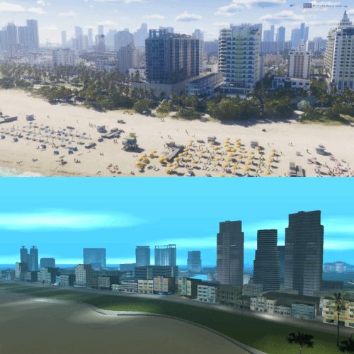 近日,一位粉丝将《GTA6》首支预告中的场景照片和2002年的《GTA罪恶都市》进行了比较,体现了新作图像在过去20年中所取得的惊人进步。