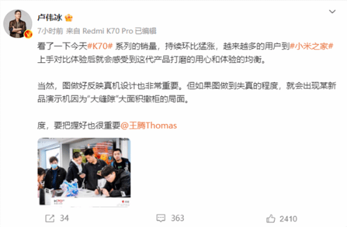 12月11日消息,日前,Redmi品牌总经理卢伟冰微博发文,称看了K70系列的销量,持续环比猛涨,越来越多的用户到小米之家上手对比体验后,就会感受到这代产品打磨的用心和体验的均衡。