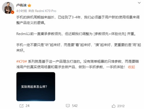 随后,卢伟冰又表示,手机的换机周期越来越长,已经到了3-4年,我们必须基于用户新的使用场景来调整产品定义的逻辑。Redmi以前一直秉承参数领先,但近期调整为“参数领先 体验优先”并重。
