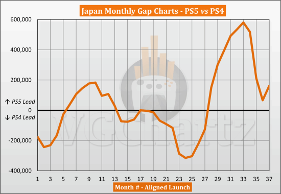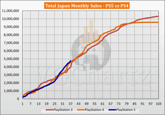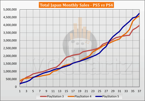 PS5在日本的第37个月是2023年11月,而对于PS4来说是2017年2月。在相同的时间范围内,PS5销售了475万台,而PS4销售了459万台。PS4在第38个月销售了与当前PS5销量相当的数量。