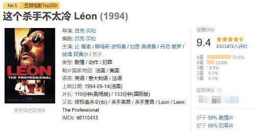 罪案剧情片《这个杀手不太冷》于1994年推出,讲述独来独往的杀手里昂与邻居小女孩玛蒂尔达的故事。本片目前豆瓣9.4分,有超过233万名用户打分,位列豆瓣TOP250榜单第5名。