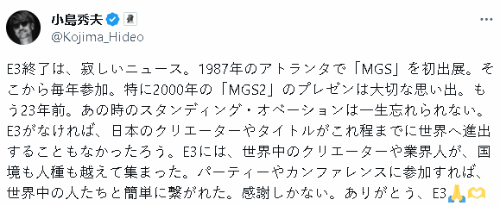 “如果没有E3,日本的创作者和游戏就不就不会像现在这样走向世界。E3跨越了国界和人种,汇聚了来自世界各地的创作者和行业人士,它很好地让来自世界各地的人建立联系。对此我只有感激之情。 谢谢你,E3。”