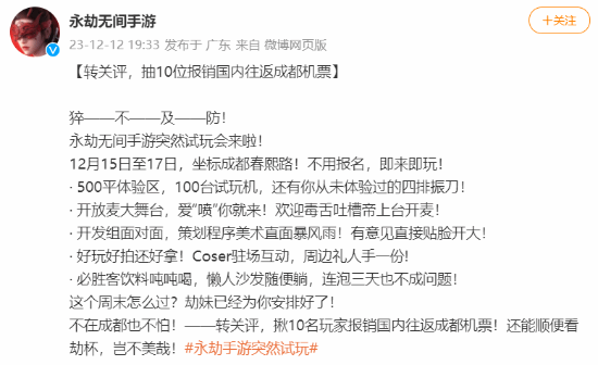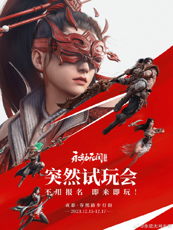 《永劫无间》手游宣布将于12月15日至17日举行试玩会,坐标成都春熙路,不用报名,即来即玩!