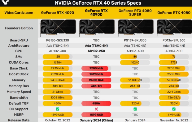 消息称RTX 4090 D显卡虽然仍基于AD102 GPU核心,但是核心编号从RTX 4090显卡的AD102-300变为了AD102-250,按照惯例,编号的降低极有可能对应着规格的降级,也就是CUDA核心数量大概率将少于RTX 4090的16384个。